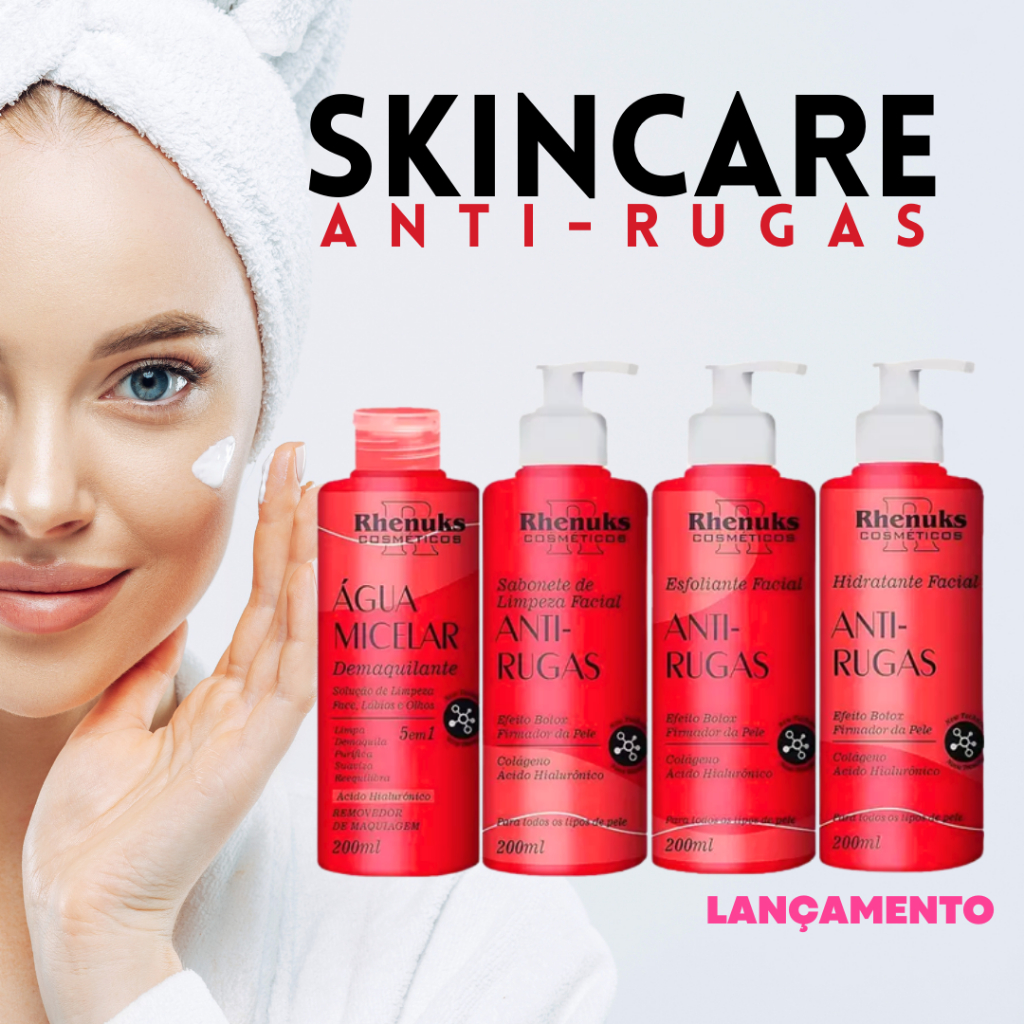 Rhenuks Skin Care - Kit Facial Anti Rugas Uso Diário (4 Produtos) O Kit Skin Care Anti Rugas da Rhenuks possui colágeno, ácido hialurônico e um aroma agradável. Confere uma sensação de pele mais jovem. Sua pele renovada todos os dias.